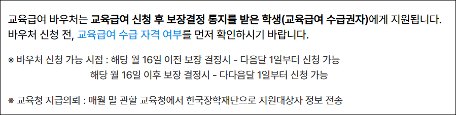 교육급여 바우처는 교육급여 수급자가 먼저 결정되어야 신청할 수 있는 구조입니다. 따라서 교육급여 신청 절차를 먼저 진행해야 하고, 이후 교육급여 수급자로 확정되면 별도로 바우처 누리집에서 신청을 해야만 지원이 이루어집니다. 이미 교육급여 수급자였던 경우에는 지속 지원이 기본이지만, 지급 방법이나 카드 정보를 변경하고자 할 때는 지정된 기간 내에 바우처 누리집에서 수정할 수 있습니다.