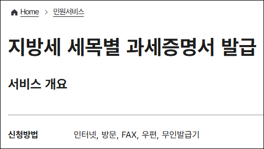 • 정부24 (www.gov.kr) — 정부가 운영하는 대표적인 온라인 민원서비스 포털로, 누구나 공인 인증을 통해 지방세 세목별 과세증명서를 인터넷으로 발급 받을 수 있습니다.